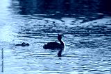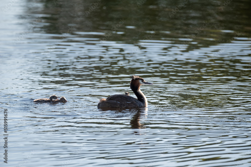 Beautiful image if Great Crested Grebe family with cute chicks on water of lake in Spring sunshine