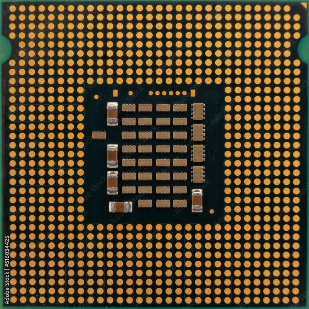 Computer CPU Processor Chip, view from the bottom side, pin connectors.