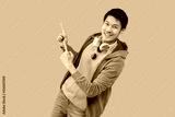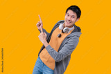 relax leisure exited lifestyle asian male adult hipster casual cloth with headphone action posture movement hand gesture point to air copy space with cheerful smiling studio shot on yellow background