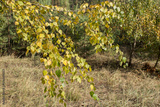 Birch tree with yellow leaves in the autumn forest. Close-up.
