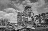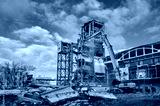 Hydraulic excavators at demolition site of industrial complex