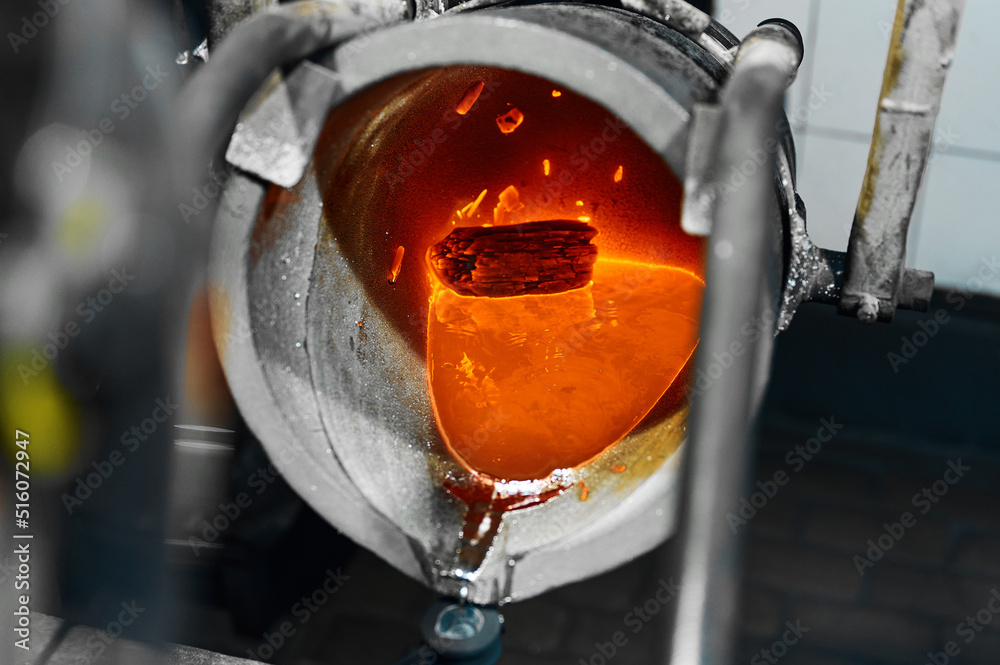 Hot red liquid silver metal in bucket in melting furnace