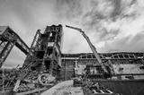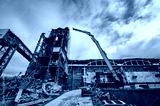 Destroyer excavator with large manipulator near factory