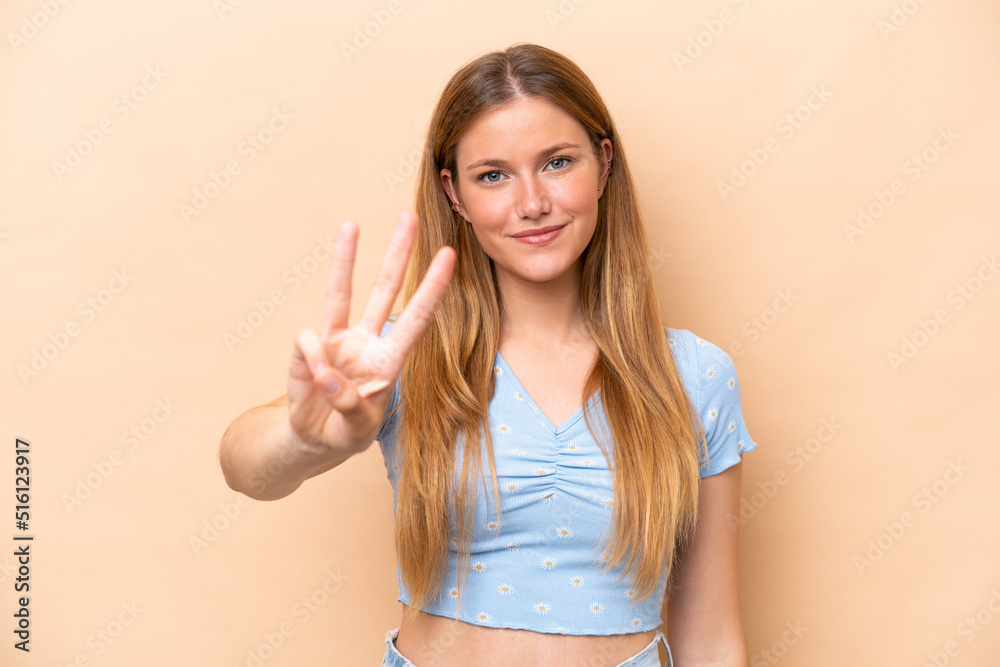 Young caucasian woman isolated on beige background happy and counting three with fingers