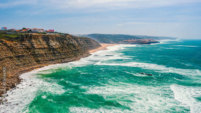 Drone view over long rocky coastline in Ericeira, Portugal, on summer sunny day. Top view - Beautiful natural landscape with ocean rocky shore. Aerial view over Scenic European tourist destination.