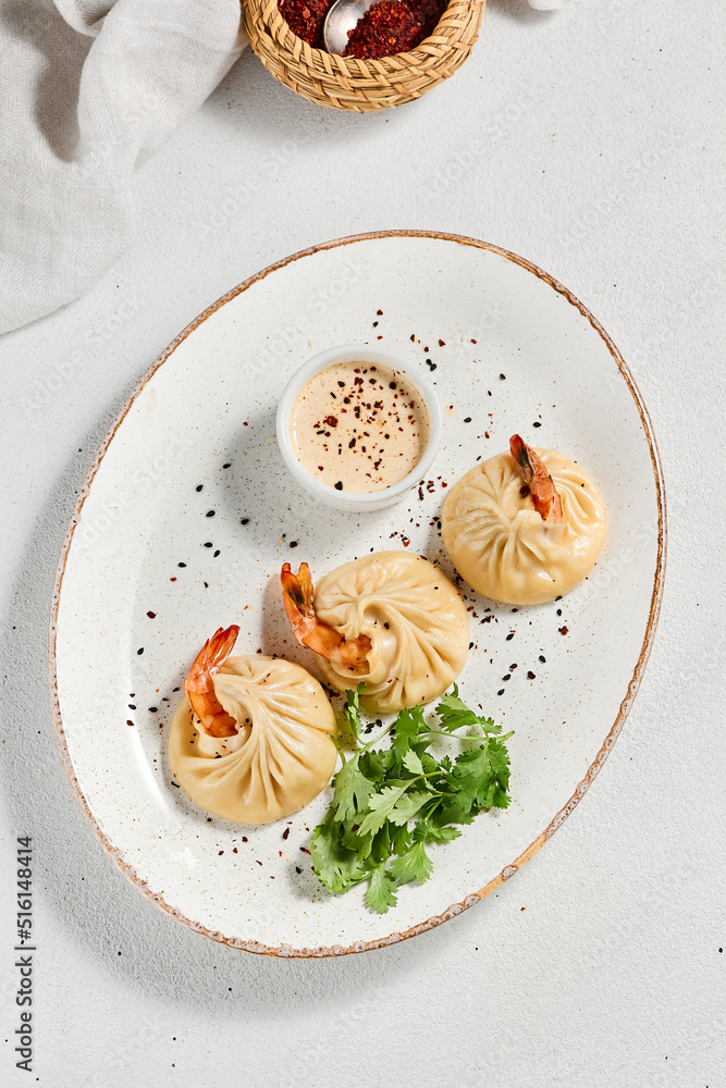 Steamed dumplings shrimp in asian style on white concrete background. Prawn dim sum with sauce on ceramic plate. Shrimp wontons on dish in minimal style. Asian dumplings with seafood.