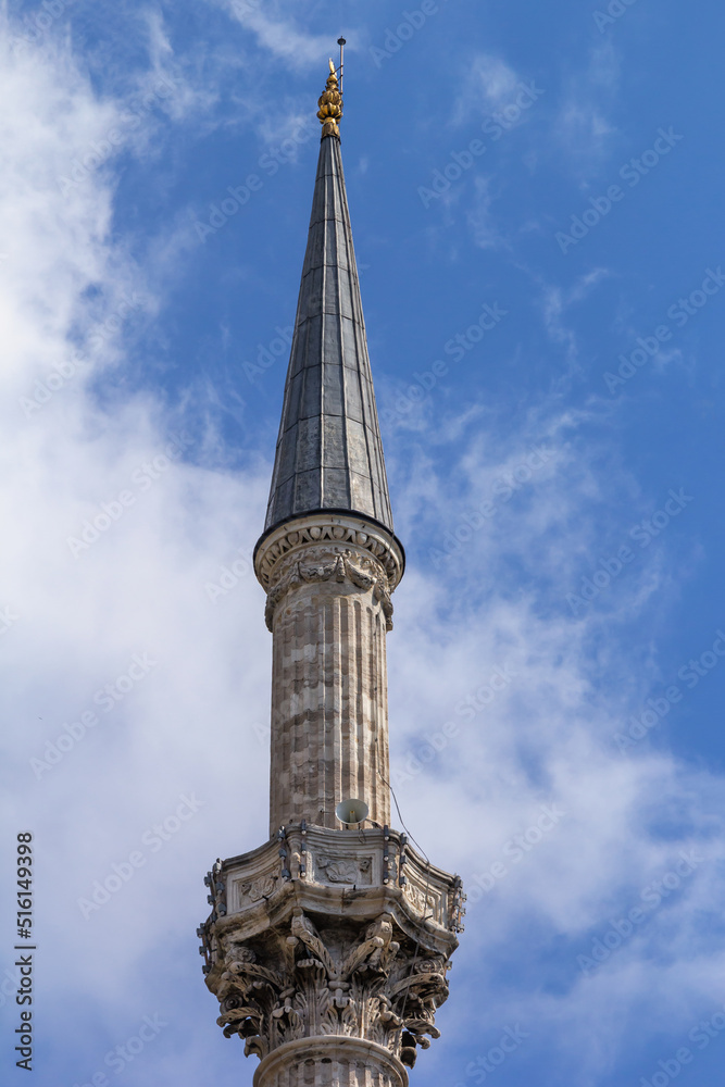 Minaret tower against a cloudy sky on a sunny day