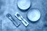 Empty bowls, spoons and linen napkins, gray grunge background. Top view, flat lay. Table setting. Eating concept.