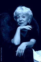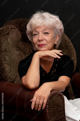 Portrait of a beautiful and smiling elderly blonde woman 60-65 years old, sitting in a chair on a black background.