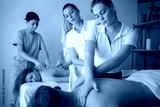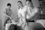Health wellness massage training.Teacher helping student training to become masseuse