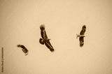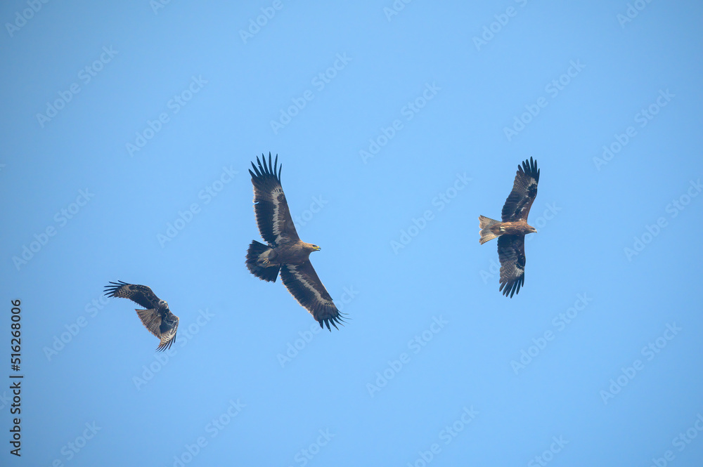 Three types of predatory birds are flying in the sky.