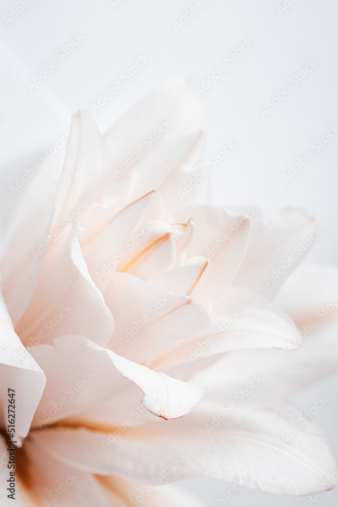 Close up white beige lily flower, natural floral background pastel color with copy space. Natural beauty blossoming lily flower. Peony blooms, vertical flowery image, celebrate nature