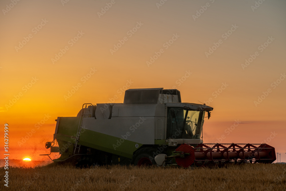 Harvest in the field.Combine mowing grain at sunset