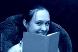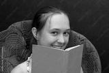 A teenage girl is laughing, holding a book in her hands.