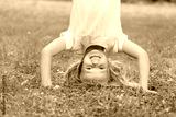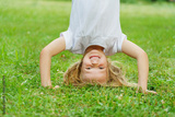 A sweet little girl in summer stands upside down. Happy carefree childhood in nature.
