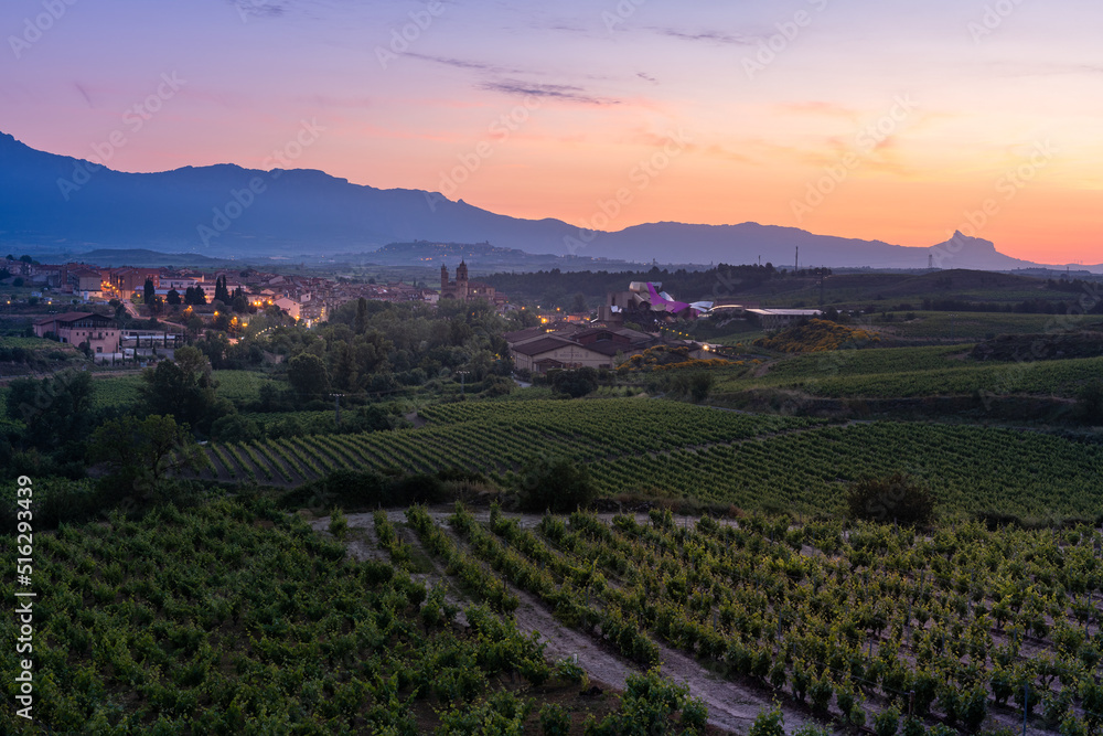 Vineyards and town of Elciego at sunrise, Rioja Alavesa, Spain