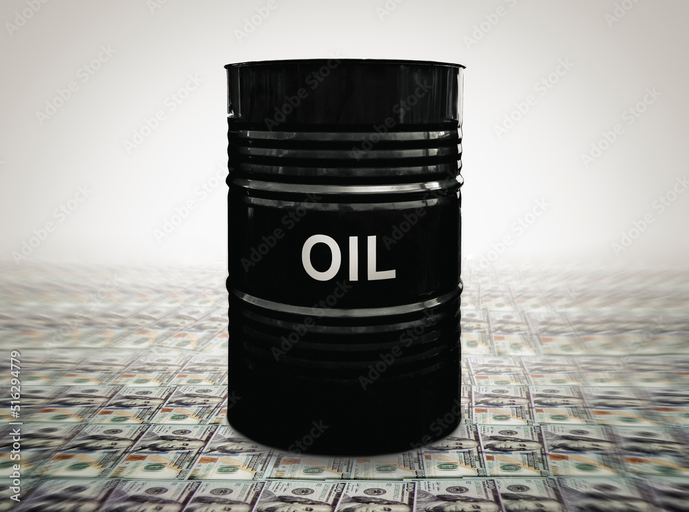 a black barrel with the inscription oil is worth dollars. The concept of earning money on the sale of oil. Oil drums on US dollars background