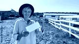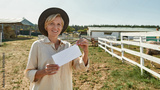 Female farmer hold and show empty card on farm