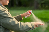 health care, protection and people concept - woman spraying insect repellent or bug spray to her hand at park