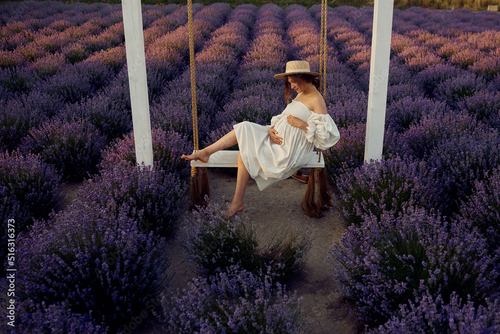 young beautiful pregnant girl on a swing in a lavender field at sunset