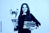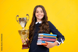 Schoolgirl in school uniform celebrating victory with trophy. Teen holding winning prize on yellow background. School kid win gold trophy.
