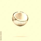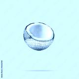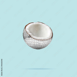 Collage made out of coconut and disco ball flying on pastel blue background. Contemporary art collage. Minimal summer concept. Party collage..