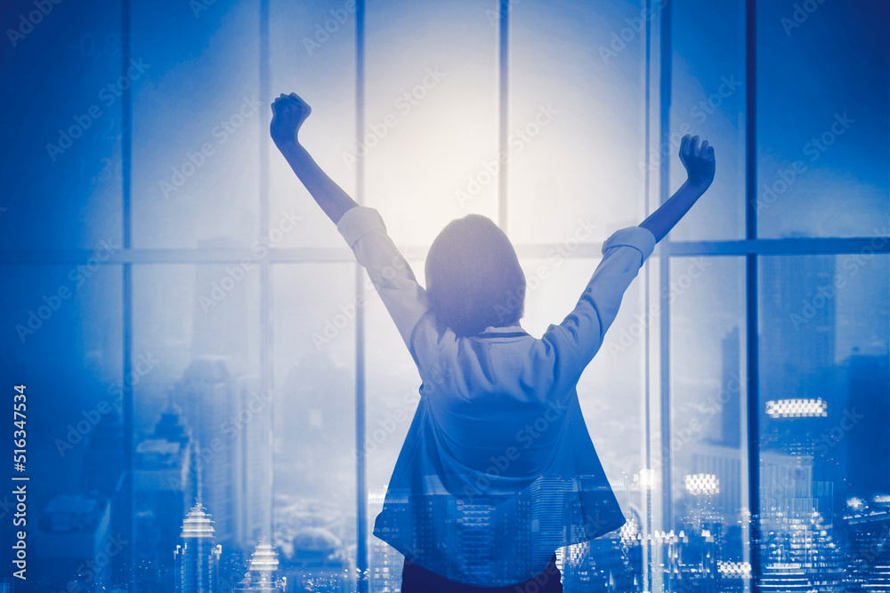 Businesswoman look at night city through window