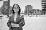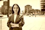 Young confident smiling Asian business woman standing on busy street, portrait. Proud successful female entrepreneur wearing suit posing with arms crossed looking at camera in big city outdoors.
