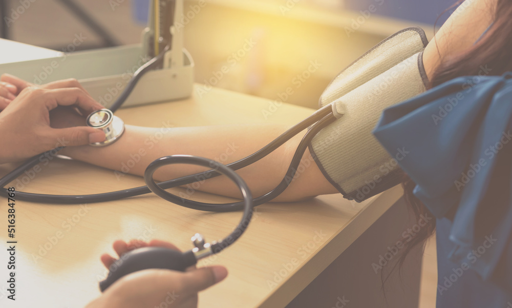 Close-up muslim female doctor using sphygmomanometer with stethoscope checking blood pressure to patient in the hospital.