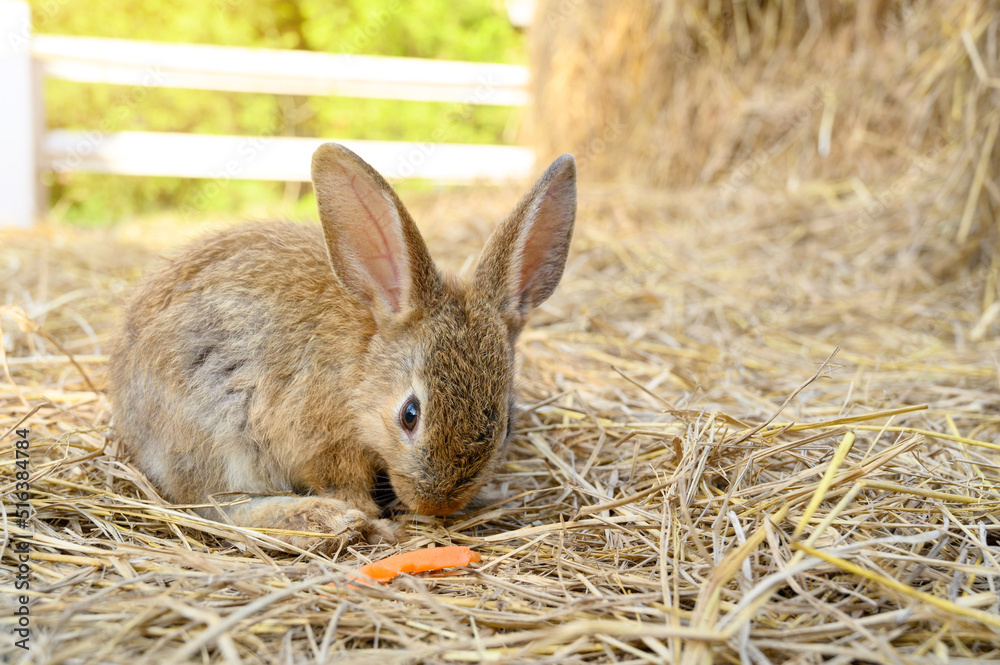 Cute brown rabbit bunny domestic pet on straw. Rabbit farm.