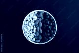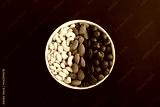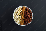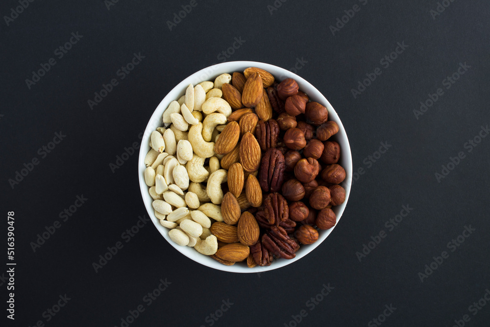 Dried nuts in the white bowl on the black background. Top view. Closeup.