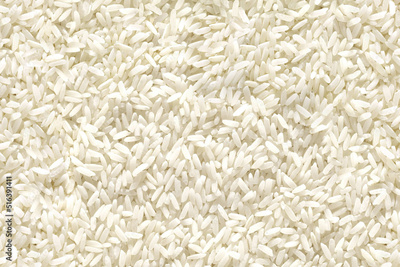 Medium and round grain white jasmine rice texture for background. Organic natural food background with copy space for text, top view. Close up rice grains flat lay. Healthy food macro concept.