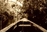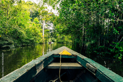 Amazon Green Rainforest Riverbank. Traditional local fishing boats, view from inside. Amazon jungle, near Iquitos, Peru. South America.