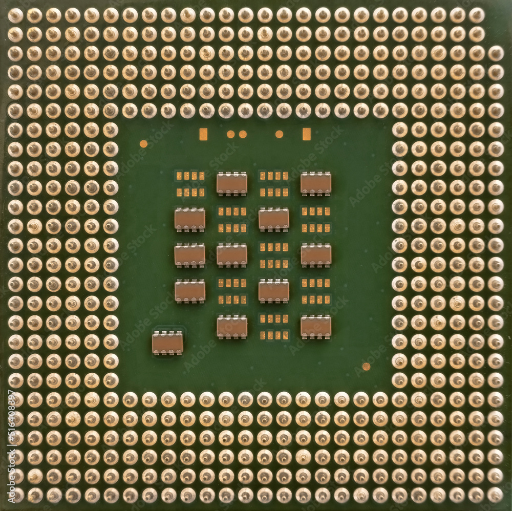 Computer CPU Processor Chip, view from the bottom side, pin connectors.