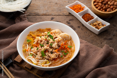 Tom Yum noodle soup ,Rice Stick Noodles with Minced Pork and meatball.popular hot and spicy soup in Thailand