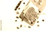 Square bread for toast with peanut butter on a wooden board. Nuts, a knife and a wooden cutting board with a sandwich and slices of bread on a white table.