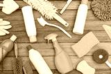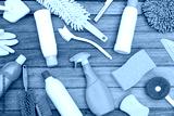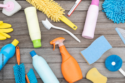 House cleaning plastic product on wood table background, home service or housekeeping concept
