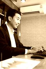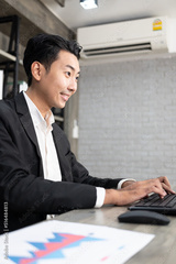 Portrait of business man using computer at workplace in an office. positive business man smiling looking into screen of computer.