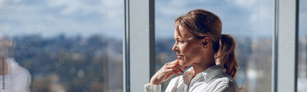 Caucasian businesswoman standing in office and looking out of window. Mature woman looking away.