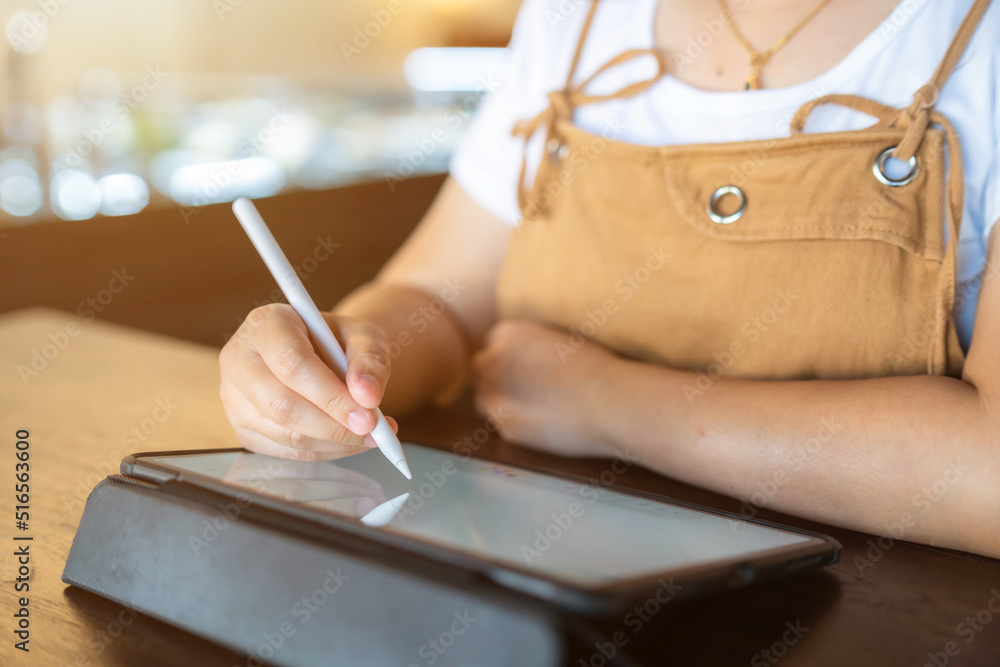 Close-up of asian freelance people business female wearing glasses stylish hipste Draw or taking note on digital tablet with electronic pen for browsing internet, chatting and blogging in coffee shop.
