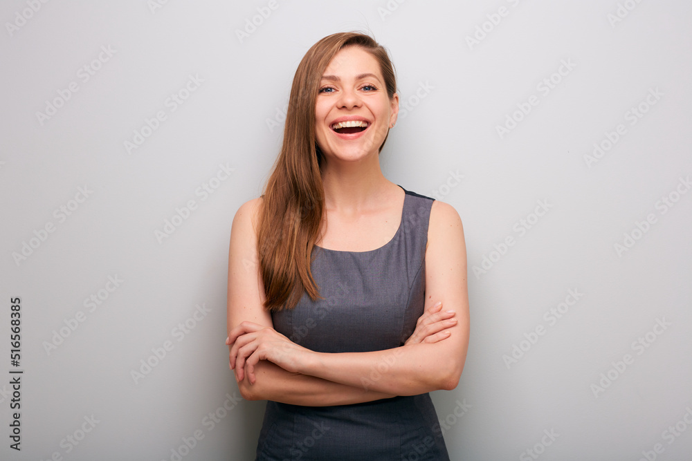 Happy business woman in dress with crossed arms. isolated female business person portrait. Mouth open, whide smile.