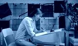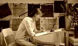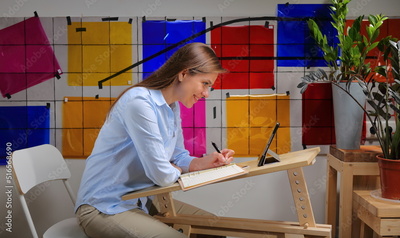 Woman designer working at table deck with Bauhaus style color palette on wall.