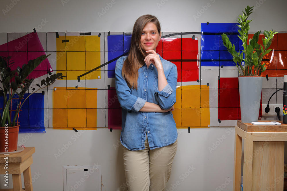 Designer female student standing in classroom with color palette on wall.