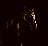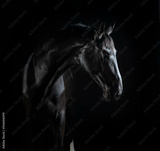 Gorgeous fine art photos of black beautiful horse on black background.