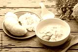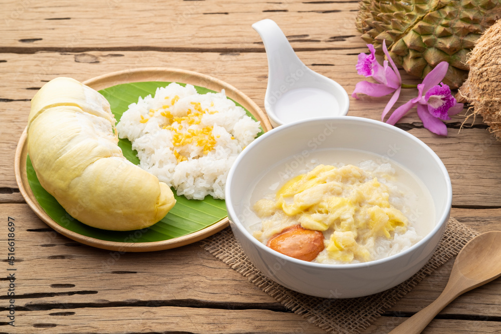 Thai sweet food,Cooked sticky rice in sweet coconut milk with Durian fruit in white bowl,popular dessert in Thailand