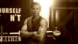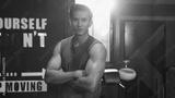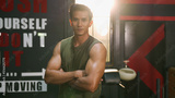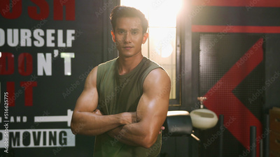Close-up or closeup shot of Asian athlete man crossing one's arm pose with confident face in fitness gym. Muscular male bodybuilder looking at camera with positive emotion. Bodybuilding at gym concept