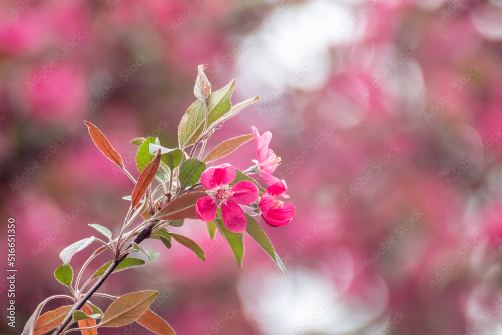 Pink apple tree blossom, big flowers on branch with green leaves. Apple tree spring delicate vibrant pink flowers bloom in garden close-up with blurred background