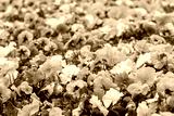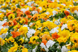 Vibrant yellow, orange and white Viola Cornuta pansies flowers close-up, floral background with blooming colorful heartsease pansy flowers with green leaves