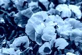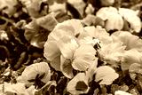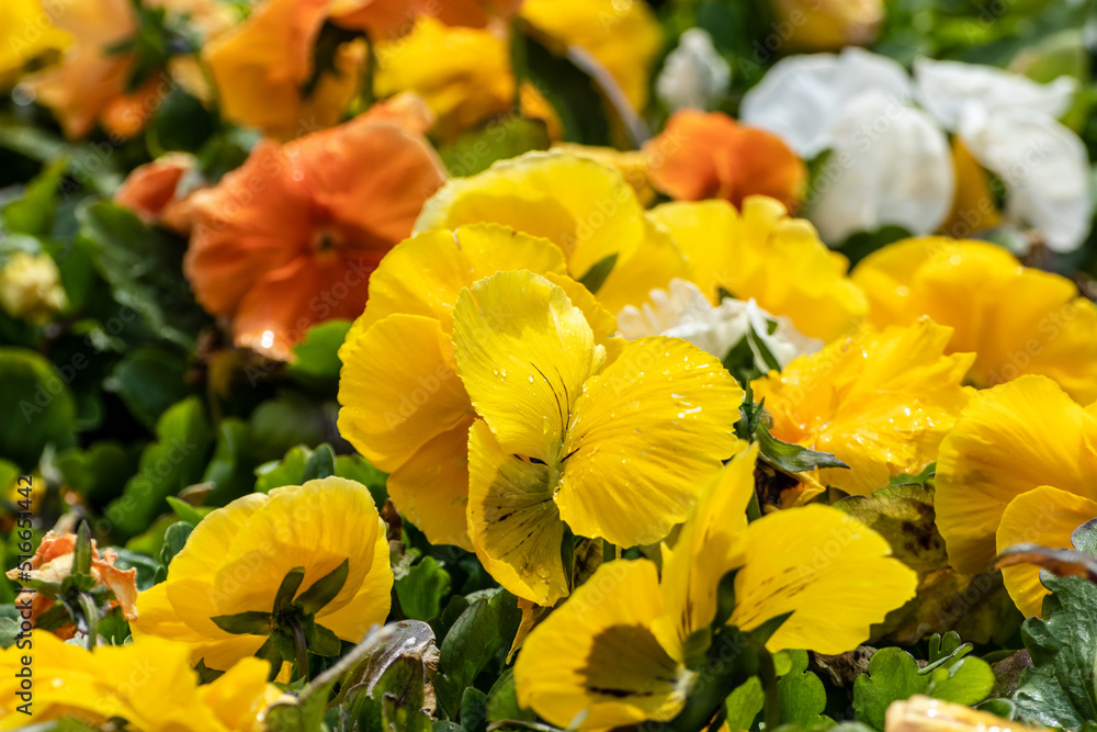 Vibrant yellow and orange Viola Cornuta pansies flowers close-up, floral background with blooming yellow heartsease pansy flowers with green leaves