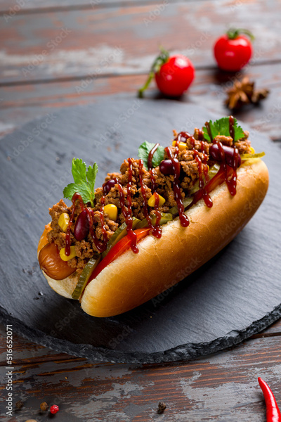 hot dog Mexican with jalapeno, corn and meat, chili con carne macro close up vertical